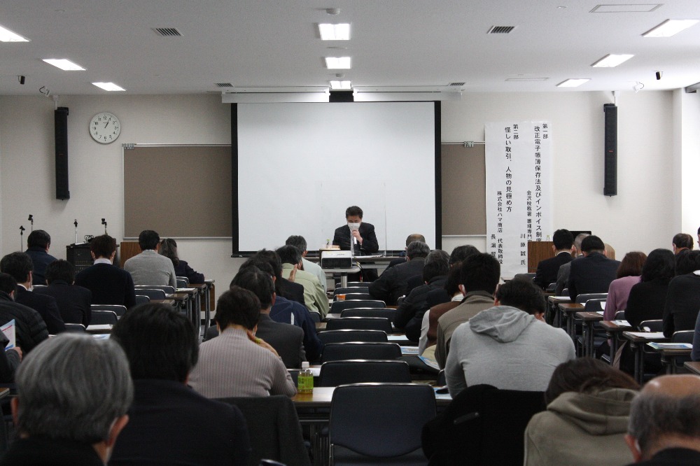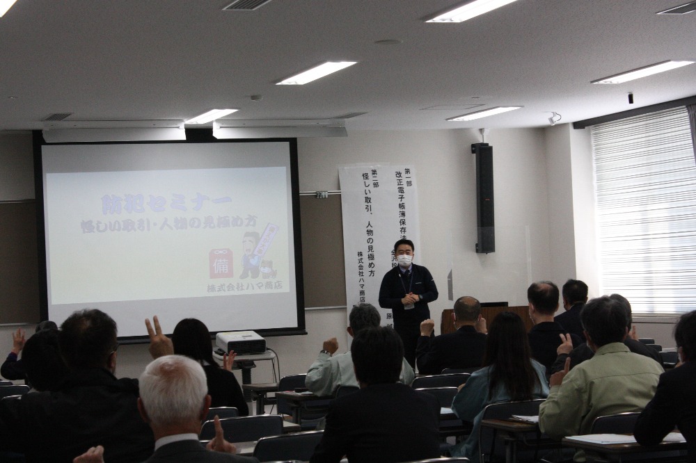 第1部では、「改正電子帳簿保存法及びインボイス制度」について金沢税務署の川原審理専門官にご説明いただき、第2部では、「怪しい取引、人物の見極め方~元警察官が伝授する詐欺にあわないための心得」と題し、株式会社ハマ商店代表取締役長濵賢治氏に、日常生活で気を付けるべきポイントなどをお話ししていただきました。