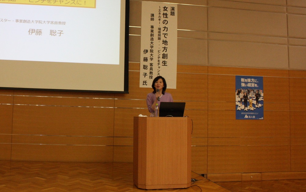 講師に伊藤聡子氏(事業創造大学院大学客員教授・フリーキャスタ―)を迎え、「女性の力で地方創生~エネルギー・環境問題・・・ピンチをチャンスに!」をテーマにご講演いただきました。